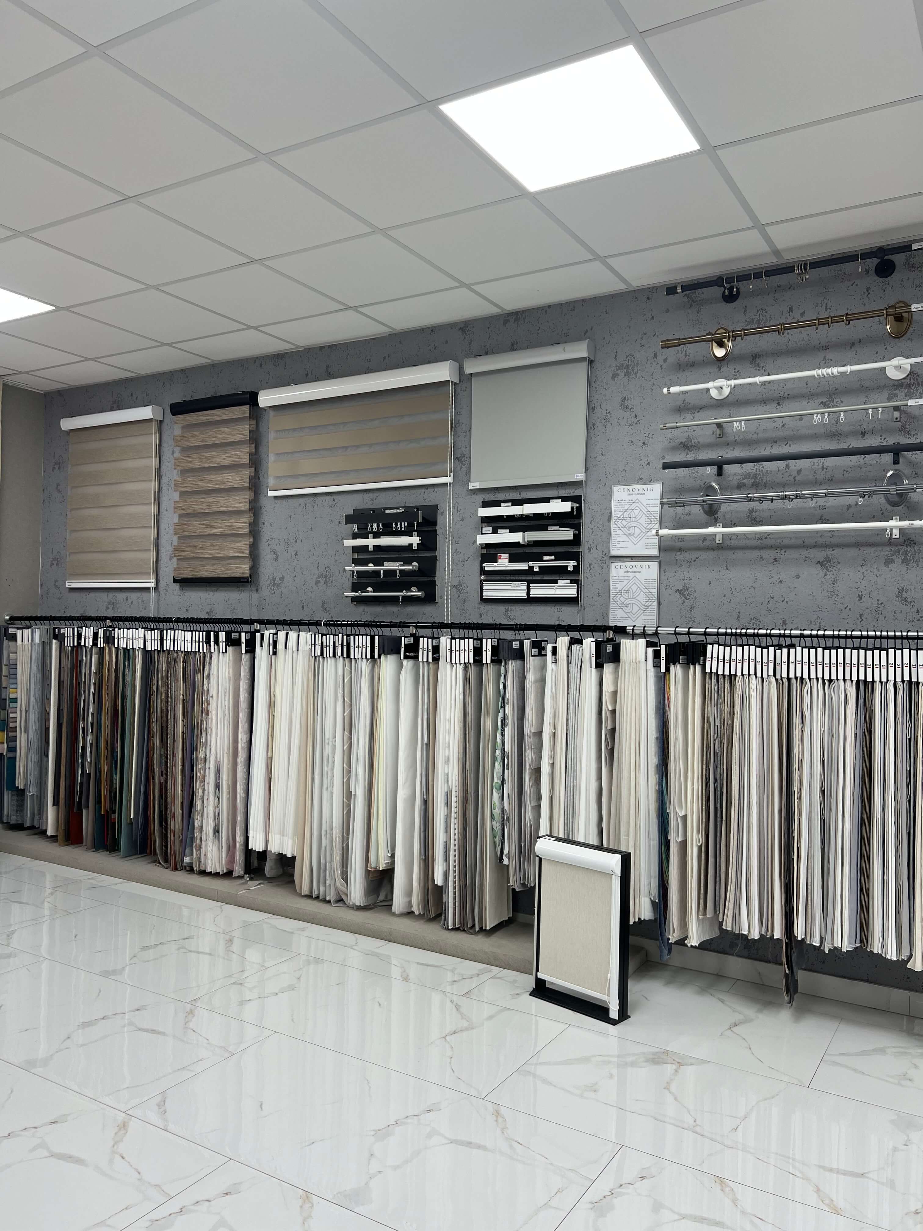 U ponudi imamo vinilne i papirne tapete, kao i FR tapete pogodne za hotele. Radimo zebra i rolo zavese po meri, kao i drapere, mebl štofove, zip i panel sisteme, drvene venecijanere, tepise, garnišne i dekorativne lajsne.